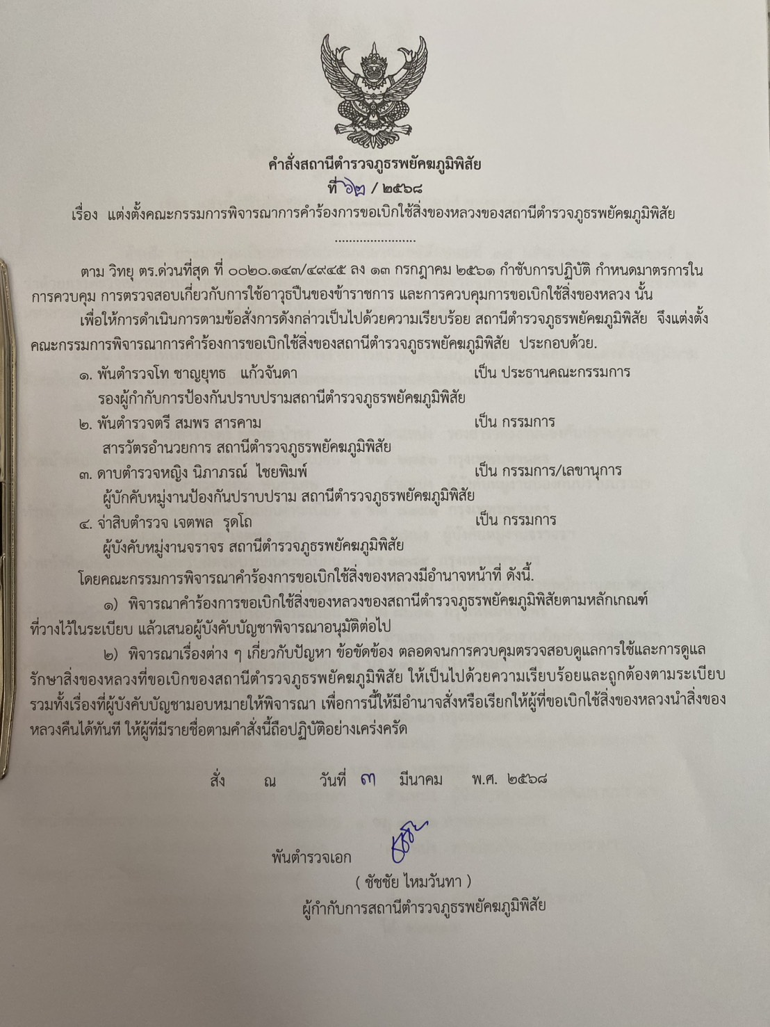 คำสั่งแต่งตั้งคณะกรรมการดูแลสิ่งของบริจาค